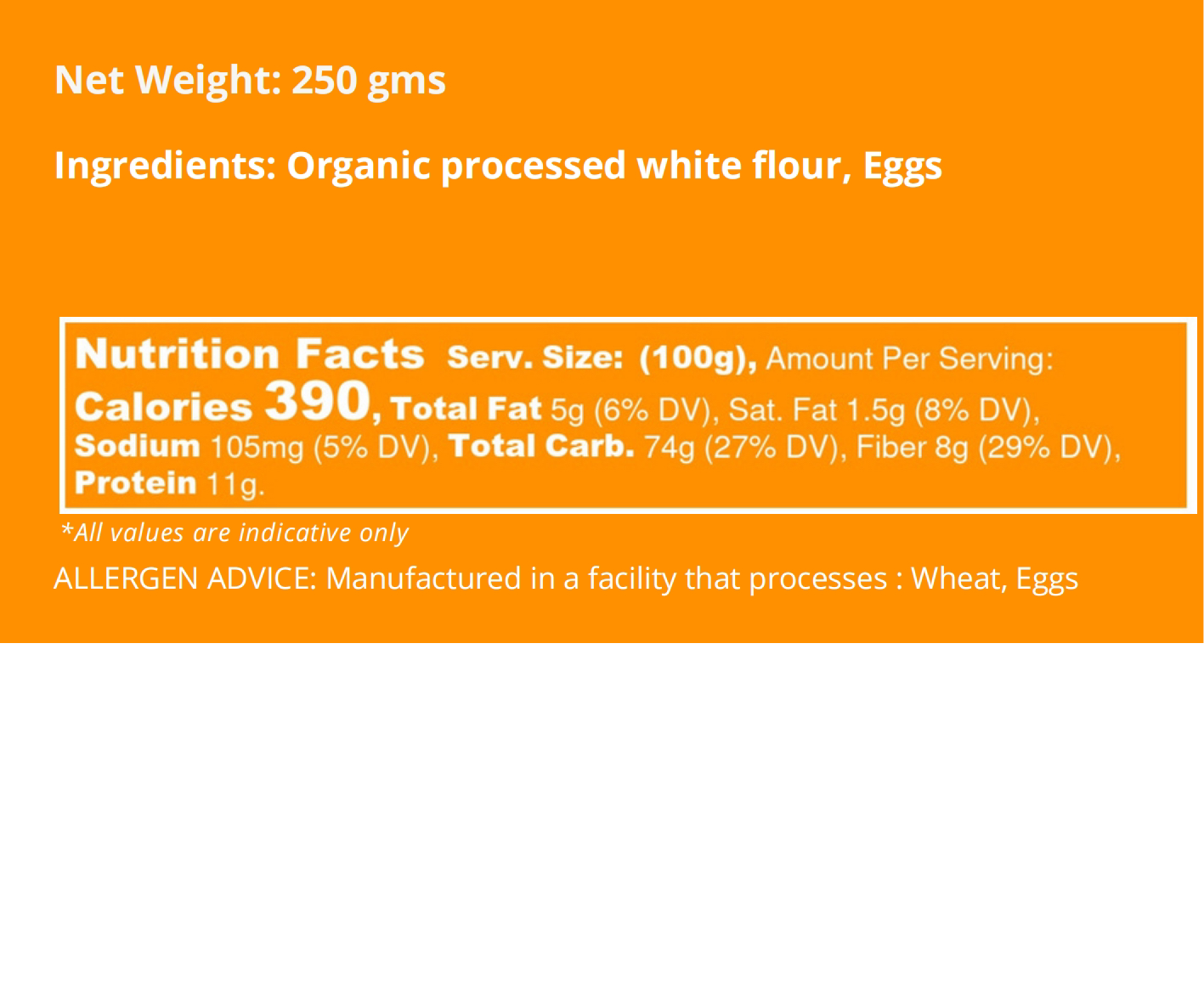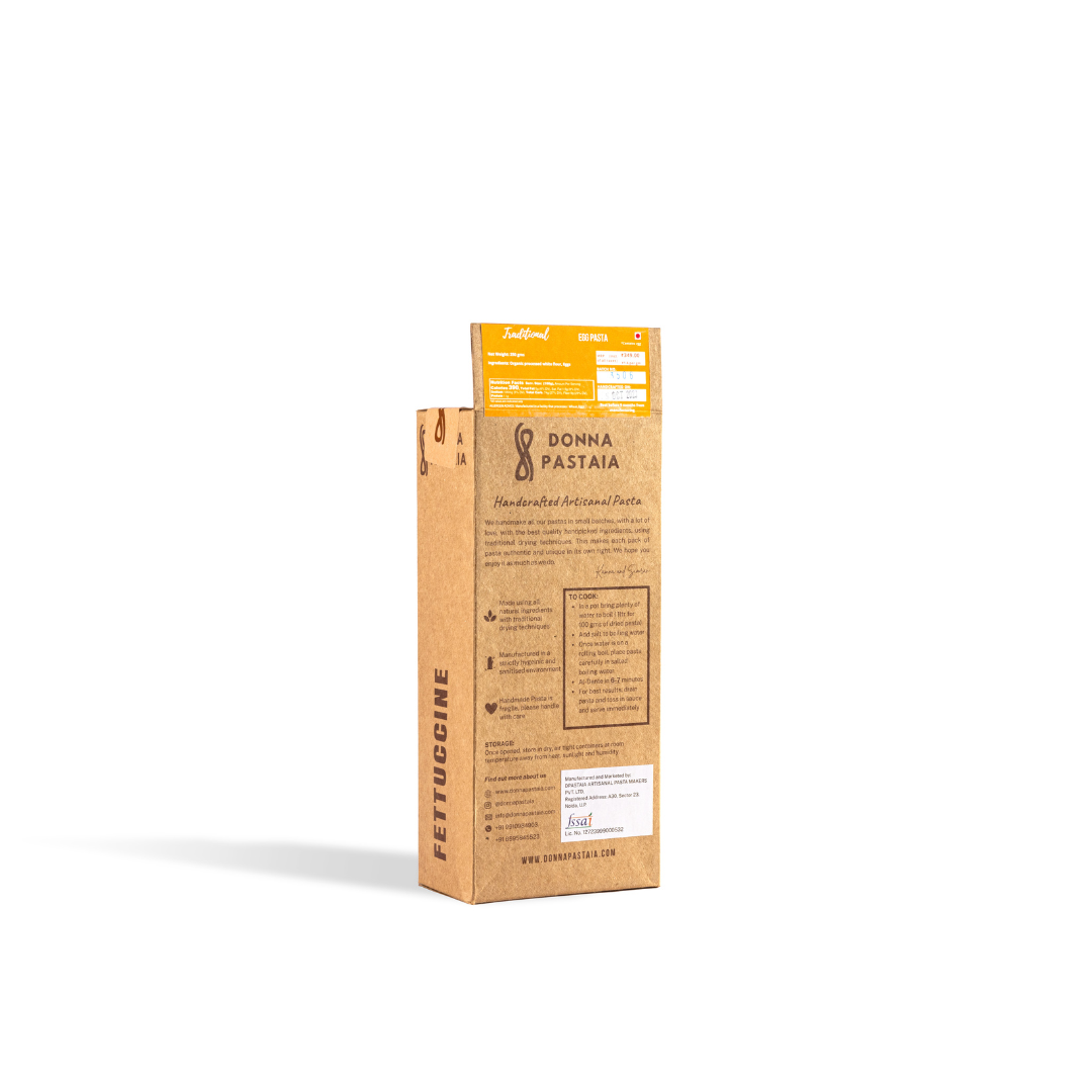 To make handmade pasta traditional of the Roman region of Italy, all you need is flour and eggs, an experienced hand and lots of pasta love. Our traditional egg fettuccine pasta is made with Organic White Flour and Eggs, rolled into ribbons and dried using time-tested techniques at low temperature for a long duration to maintain the integrity and benefits of the handpicked ingredients that make it.