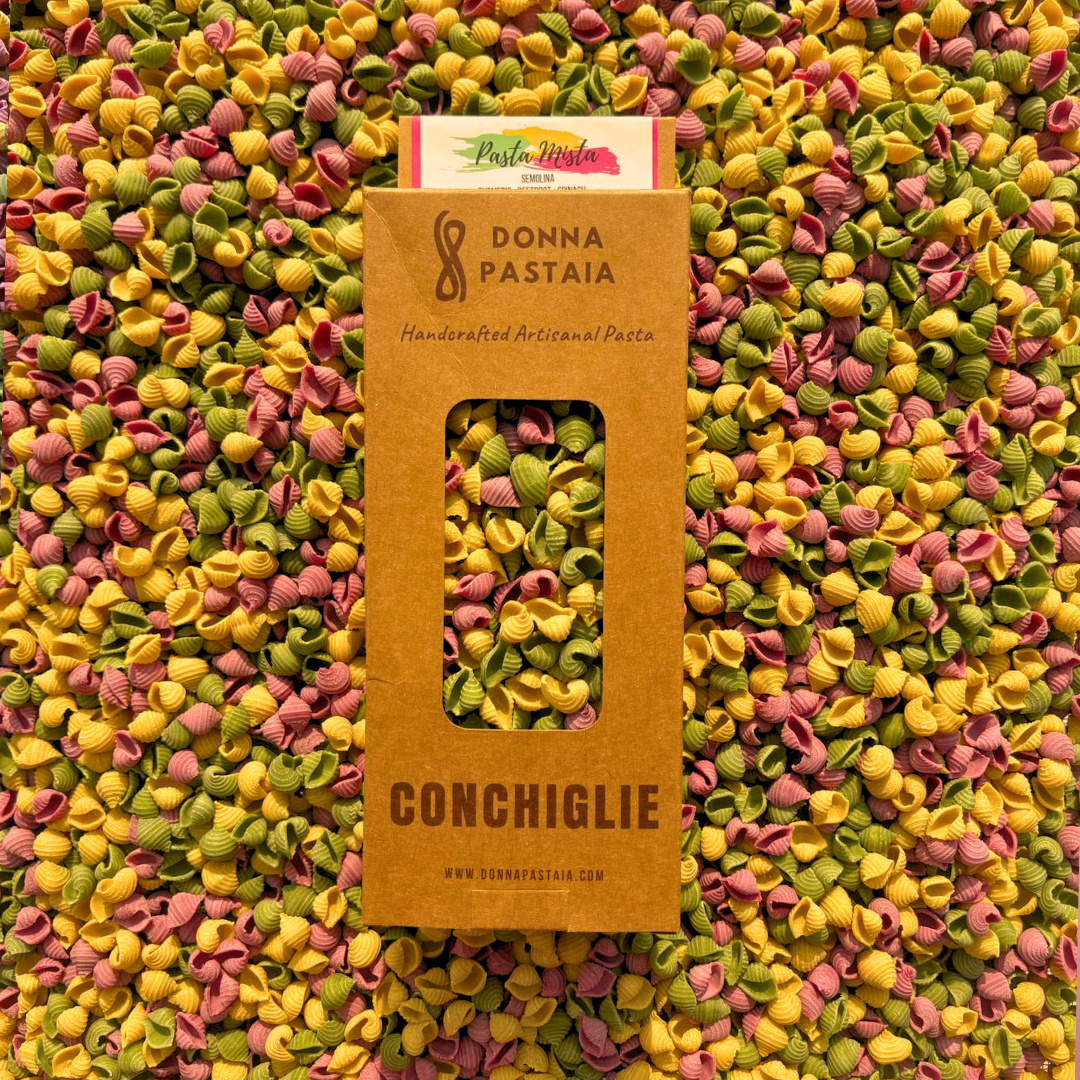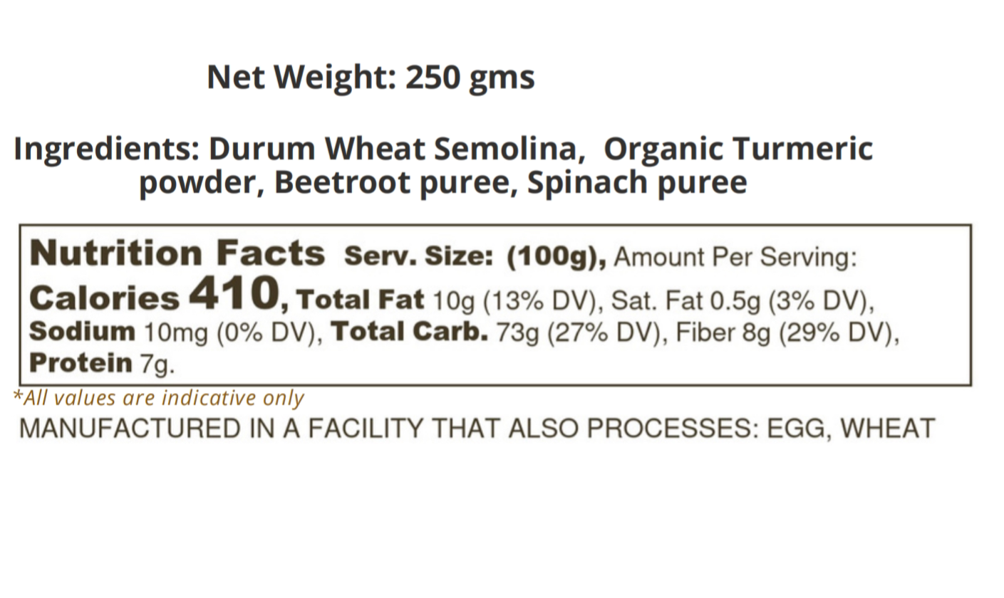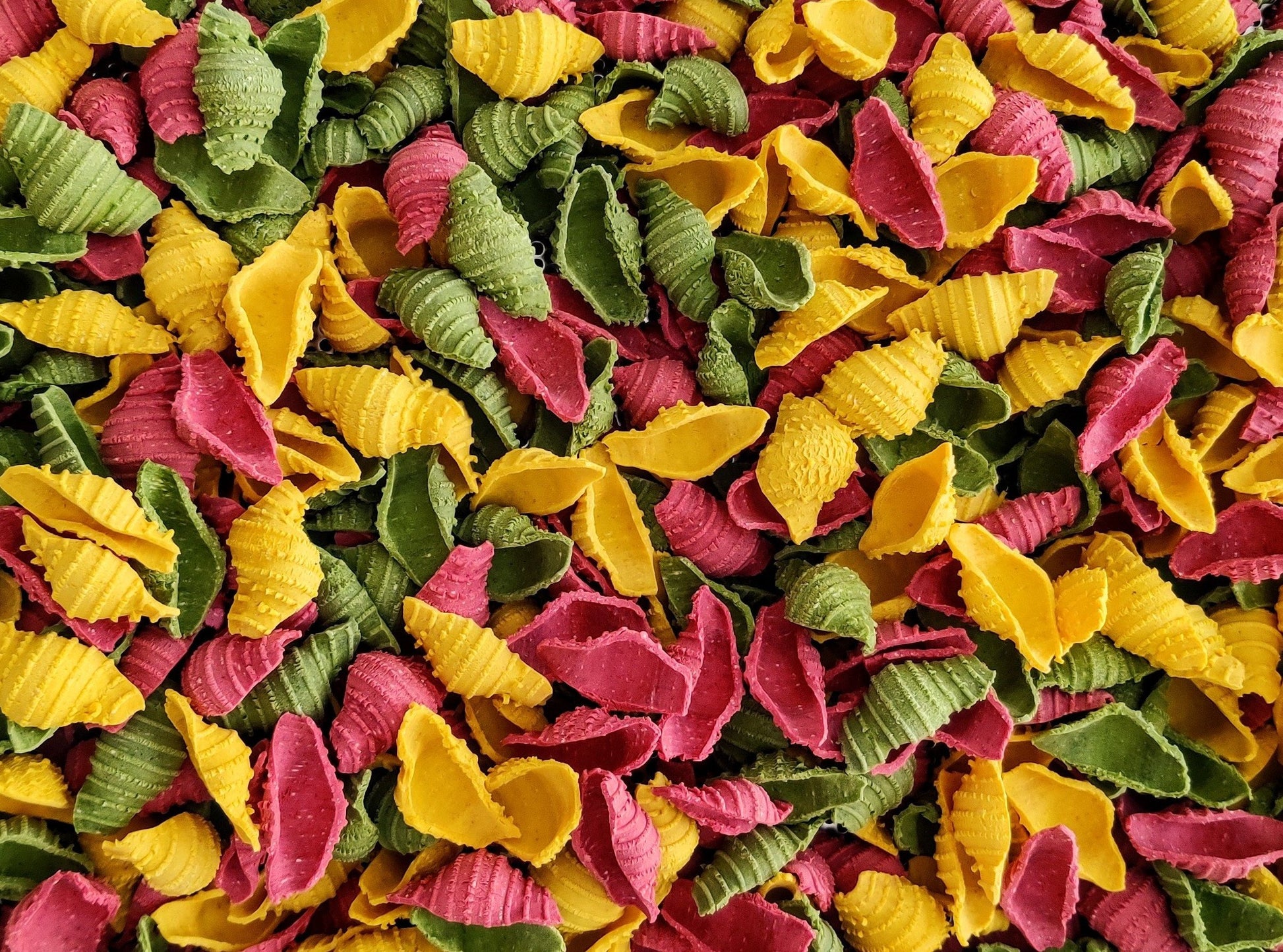 Bringing to you our most colourful pasta, these are shell shapes, conchiglie (con-kay-lee) in a 100% organic semolina (suji/rava) dough made brighter and better with organic turmeric, spinach and beetroot.